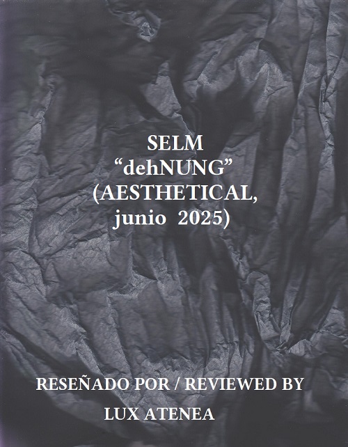 Lo tenebroso surgirá en el tema “CdM9th b” entremezclando el estilo dark ambient con la experimentación electrónica más transgresora, incorporando incluso fugaces pinceladas sonoras propias del noise japonés más retador, hasta envolvernos con este siniestro caleidoscopio cercano conceptualmente al high-tech ambient más oscuro. “CdM9th b” es una obra maestra que se convertirá en faro creativo para artistas y bandas musicales dentro de esta escena por su avanzada perspectiva adelanta a su tiempo. ¡¡¡“CdM9th b”, chapeau Selm!!! Luego, el tema “oBviR nR2” nos fascinará con una nueva mirada musical dentro del estilo industrial donde lo distópico proyecta sus inquietantes sombras tecnológicas. Un escenario dinámico y, hasta cierto punto, mefistofélico debido a su trasfondo unido a la perdición no vista ni sentida en el presente, hasta que ya es demasiado tarde. “oBviR nR2” proyecta el deseo de deificación humano unido a la tecnología, posee ese halo hipnótico que lleva a la ruptura con lo ético y moral por ser obstáculos para el progreso, y transmite ese impulso inexorable hacia el individualismo como materialización de las aspiraciones de la persona en esta vida, o sea, de su esclavitud a su propio Ego. Llegando hasta las puertas del tema “MEdleC5”, la aceleración en la acción sorprenderá al melómano lector de Lux Atenea por su nitidez sonora tan próxima y por sus implacables pasos adelante imposibles de parar. Una firmeza en la acción casi marcial donde cada paso dado es una elevación en el nivel de poder, desarrollándose como una siniestra danza macabra tecnológica que no puedes dejar de observar por su belleza sublime, dándole cierto brillo y atracción demoníacas. Con el tema “NranSz e3” extendiendo el telón de clausura de este álbum, de esta obra maestra compuesta por Selm, la evanescencia de lo obscuro presentará matices sonoros unidos a lo vital que se verán alterados con la presencia de lo artificial recreado conceptualmente a nivel industrial. Oscilante y eléctrico, “NranSz e3” es imprevisible y analógico como un arco voltaico resplandeciente e inestable, moviéndose con esas fascinantes formas que parecen tener vida propia. Un dinamismo sonoro y una definición en sus detalles musicales que obligan a varias audiciones para poder descubrir y sentir su grandeza artística hasta en su mínimos detalles. “dehNUNG”, Selm marcando parámetros conceptuales de vanguardia dentro de la escena industrial actual donde su eclecticismo no altera en absoluto la esencia artística primigenia del industrial, y su proyección filosófica y existencial recreada en composiciones musicales transgresoras. ¡¡¡Disfrútenlo!!!