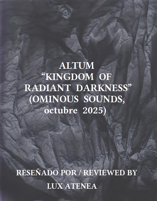 Sin más demora, iniciamos la audición del álbum “Kingdom Of Radiant Darkness” adentrándonos en este entorno agreste y desafiante, a pesar de su apertura luminosa creciente que puede hacer pensar en una composición ambient. Será la entrada de poderosos planos sonoros de corte ctónico en un segundo plano, y esta envoltura musical obscura y solemne, lo que reconducirá rápidamente todo hacia una composición dark ambient de vanguardia. Pinceladas melódicas como trasfondo que se diluyen, la entrada en esta obscuridad que sobrecoge, los ecos latentes en un entorno en movimiento donde todo está oculto a la vista… van conduciéndonos por esta tenebrosa travesía con la belleza siniestra perfilando esta inmersión en la solemnidad ultraterrena. Cautivados por su inmensidad, paralizados por su influjo hierático, en este imparable avance terminará apareciendo lo etéreo, lo espectral, esa presencia elevándose en este escenario donde el tiempo va abandonando su influencia en el devenir, presentando un halo con aires de inmortalidad cuyos claroscuros provocan inquietud y atracción espiritual a su vez. En constante evolución, “Kingdom Of Radiant Darkness” va abriéndose por fases musicales, entrando ahora en la contemplación de lo denso bajo el impacto de la acción mientras es decorado con pinceladas celestiales, y con estas fugaces presencias. Un submundo desolador en donde van confluyendo la calma espiritual con estos arranques repentinos de colisión con sus límites, como si se buscara ampliarlo o abrir una vía de escape. Más adelante, lo fantasmagórico va a ir adquiriendo un mayor protagonismo en la composición, pero siempre situando estos planos sonoros en lo más alto de su estructura musical. Una delimitación clara de sus dimensiones que se siente claramente en cada una de sus direcciones, mientras el melómano lector de Lux Atenea es poseído por la magia sonora de Altum.