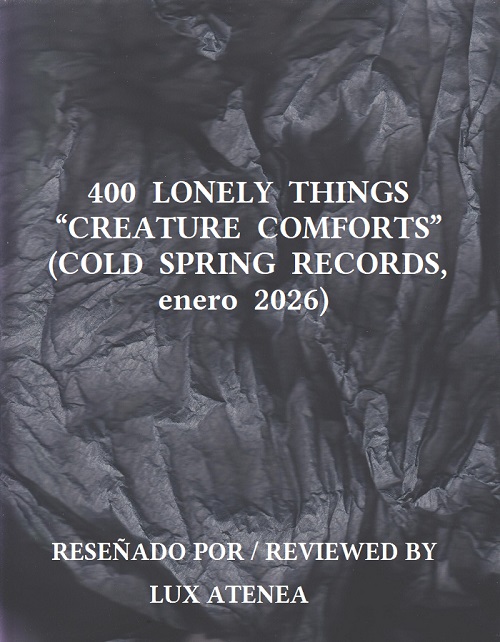 “Alleluia” es el tema más rupturista que encontrarán en este álbum. Lo experimental llevado a otro concepto, y todo en un segundo plano dentro de su estructura como si fuera una psicofonía donde se graba algo sucedido en el pasado. El estilo folk completamente reestructurado a nivel conceptual por su dimensión artística experimental, y con ese inconfundible estilo de composición estadounidense emanando permanentemente durante toda su audición. Lo tribal define a “In Memory Of Sol Neely” en su comienzo, para luego degradarse en clave conceptual experimental obscura que desdibujará absolutamente todo hasta hacerlo irreconocible. A través de un cambio de 160 grados por su alma musical, en el tema “Soothe Faded Hue” volverán las iridiscencias sonoras cuyos destellos iluminan todo alrededor, y cuyo movimiento es el reflejo de otros espacio-tiempo en constante cambio. Planos sonoros siniestros harán acto de presencia para que no olvidemos que, incluso aquí, el Mal siempre está al acecho, y a la más mínima oportunidad no dudará en tomar posesión de este entorno para someterlo y degradarlo. Con las iridiscencias desapareciendo de su estructura musical, el caos y la locura aparecerán como un torbellino que todo lo arrasa, desembocando en el tema “The Moth Of Ending” donde el estilo ambient tiene esa inquietante esencia apocalíptica sin necesidad de entrar de lleno en el dark ambient. Una iluminación afilada, cortante, en espacios sublimes que transmiten pavor por lo que reflejan. “The Moth Of Ending” es una composición perfecta como antesala del tema homónimo del álbum, clausurándolo con un despliegue musical ambient un tanto nebuloso y bucólico, y con el rítmico sonido de las olas transformando al tiempo en ese testigo que termina olvidándolo todo. En “Creature Comforts” también hay una presencia siniestra de corte orgánico, transmitiendo esa decadencia y degradación de lo físico, de lo carnal, de lo material en este mundo que algunos creen que siempre existirá. “Creature Comforts”, primera de las dos grandiosas obras musicales de 400 Lonely Things publicadas en este año 2026 por el mítico sello discográfico británico Cold Spring Records en lujosos digipak 2CD. ¡¡¡Disfrútenlo!!!
