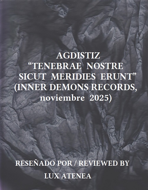 En el mes de noviembre del pasado año 2025, el genial artista rumano Benjamin presentó su nuevo álbum musical “Tenebrae Nostre Sicut Meridies Erunt” (“Nuestra oscuridad será como el mediodía”) publicado a través del prestigioso sello discográfico estadounidense Inner Demons Records en formato digital, estando disponible a través de su página oficial en Bandcamp. De tenso diseño de portada en blanco y negro, la fuente de inspiración que fundamenta al álbum “Tenebrae Nostre Sicut Meridies Erunt” está relacionado con el alma y su vagar por ese otro mundo post mortem donde lo oscuro, lo numinoso, y lo trascendente están presentes en un entorno donde el tiempo no existe. Lo tenebroso, lo divino, todo en el álbum “Tenebrae Nostre Sicut Meridies Erunt” es profundo y con una mirada artística de vanguardia a nivel conceptual. Benjamin, como alma mater de AGDISTIZ, da trasfondo místico y sentido musical al mensaje definido a nivel sonoro, fundamentando cada uno de los ocho temas que vertebran esta extraordinaria obra. Como comenté en la reseña que publiqué sobre su magna obra “Orphaclophus”, el nombre de AGDISTIZ está inspirado en la diosa frigia Agdistis de carácter andrógino y heredera del culto ancestral a la Gran Diosa Madre, y, en el álbum “Tenebrae nostre sicut meridies erunt”, el artista rumano Benjamin se encuentra en su labor creativa bajo la influencia conceptual de estilos como el power electronics, electrónica experimental analógica, dark ambient, noise, high-tech ambient, industrial… Un eclecticismo en la composición que fascinará a los melómanos lectores de Lux Atenea que buscan innovación y belleza (incluso muy siniestra en esta escena), sobre todo, si desean disfrutar un álbum musical grandioso mayormente compuesto dentro del estilo power electronics.