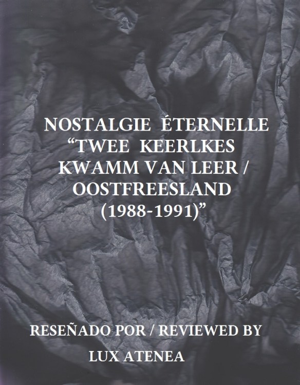 Este 2CD del álbum “Twee Keerlkes kwamm van Leer / Oostfreesland” ha sido publicado por el prestigioso sello discográfico francés Infrastition, incluyendo en su interior esta magnífica selección de temas grabados entre los años 1988 y 1991. Además, hay interesante información detalladamente explicada en este libreto de ocho páginas, junto a una breve descripción de la historia musical de Nostalgie Éternelle. La impresión de algunas de las letras de estas canciones han sido agrupadas por el lugar de origen de su grabación, Leer o Mainz, habiendo sido compiladas por Dieter Mauson en junio de 2011 (Hamburgo, Alemania) tras ser masterizadas de cassette a CD por Inox Kapell en el mes de julio, siendo posteriormente remasterizadas por Georg Monninger en agosto de ese mismo año en la ciudad de Berlín. Además, las fotografías que decoran este libreto fueron tomadas por Monika Mauson en el año 1982, quedando superpuestas sobre dibujos realizados por el propio Inox Kapell para ofrecernos un acabado final de lo más sorprendente en su esencia visual. Observando estas imágenes, me ha resultado curioso que hayan escogido para la portada de esta edición discográfica, la imagen tomada por Ralf Mauson en el año 1987 con árboles y el cielo azul como fondo, al igual que se hizo con la portada del álbum “Sans Fin” anteriormente mencionado. Una imagen de portada que sintetiza y da sentido a este eje conceptual marcado por lo natural elevándose hacia lo universal, o sea, hacia lo que es casi eterno. Intemporalidad artística que marca y define con exactitud el talento musical de Nostalgie Éternelle en sus composiciones, y con una belleza sonora tan sublime que el alma de los melómanos lectores de Lux Atenea se identificará inmediatamente con ella en cuando escuchen su música.