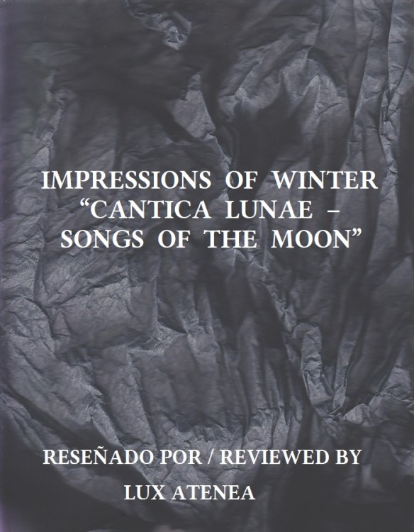 “Cantica Lunae – Songs Of The Moon” fue el título del álbum de debut presentado por Impressions Of Winter, uno de los grupos de culto que más valoro y que más pasión me provoca dentro de la escena musical neoclásica. Publicado en el año 1996 a través del prestigioso sello discográfico alemán SPIRIT PRODUCTION dirigido por Mozart, alma máter del mítico grupo musical Umbra et Imago, como no podía ser de otra forma, en “Cantica Lunae – Songs Of The Moon” contarían con su ayuda en labores de producción ejecutiva que serían fundamentales para perfilar su registro musical y su edición discográfica en CD. Formado por Laikha, Joe (Joachim Proell), Tobias Franz, y Andres Waldura, el grupo musical Impressions Of Winter grabó cada uno de estos temas entre los años 1994 y 1996 dentro de una paciente labor artística orientada a ofrecer alma artística y calidad musical como irrenunciable llama para iluminar y dar vida a cada una de estas composiciones. Esta meticulosa estructuración instrumental, esta brillantez melódica, y esta definición espiritual de su lírica serán nítidamente percibidas por los melómanos lectores de Lux Atenea que tengan este álbum en sus manos, porque esta preciosa edición discográfica está destinada a ofrecer el máximo placer a sus sentidos. Con música compuesta por Joe P. y lírica a cargo de Laikha y Andres Waldura, Impressions Of Winter presenta una innovadora y revolucionaria mirada darkwave dentro del estilo musical neoclásico donde lo ecléctico y lo clásico encuentran ese punto común de esplendor. Magia en su sonoridad que adquiere ese lenguaje radiante que tanto aprecia y siente nuestra alma, sobre todo, a través de la espectacular voz de Laikha, cuya fuerza e intensidad interpretativa potencia cada una de estas composiciones hasta transformarlas en este embrujo sonoro tan especial, y que solamente el armonioso registro de una voz femenina puede ofrecer al melómano enamorado de este registro de voces. Tras la publicación del álbum “Cantica Lunae – Songs Of The Moon”, Laikha abandonaría esta formación artística, ofreciendo otra de sus gloriosas contribuciones al mundo de la música non-mainstream con su participación en los brillantes coros de algunos de los temas incluidos en el excelso álbum de Umbra et Imago “Mystica Sexualis”, publicado también en el año 1996. En definitiva, en “Cantica Lunae – Songs Of The Moon” podrán paladear estos once temas inolvidables que vertebran la ópera prima de Impressions Of Winter, álbum lleno de talento, de espiritualidad, y de Cultura.