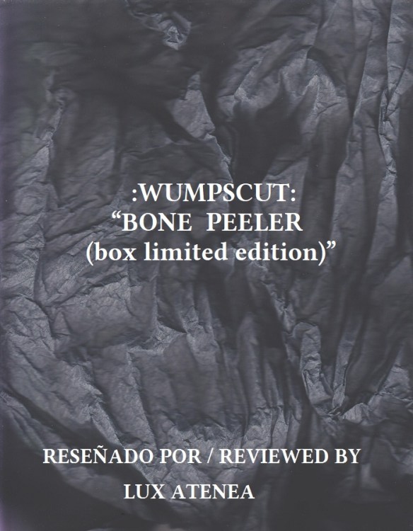 Como analista musical non-mainstream, tratar de descubrir ahora a :Wumpscut: me parece absurdo, y más habiendo tenido el placer de seguirlo desde sus inicios artísticos. En cambio, si que me parece importante analizar su extraordinario álbum “Bone Peeler”, a través del cual dio continuidad a la excelente trayectoria musical que atesoraba. Una innovación conceptual dentro de la escena electrónica más oscura donde el talento musical destaca por encima de todo. :Wumpscut: ha creado una forma, un estilo de hacer música electrónica, y sus composiciones se han convertido en punto de referencia para muchos otros artistas y grupos musicales dentro de esta escena electrónica surgidos con posterioridad, y a la sombra de su éxito entre el público. En el álbum “Bone Peeler”, :Wumpscut: siguió proyectando nuevas estructuras musicales basadas en sus sonidos industriales ya característicos, pero con una estética minimalista en entornos degradados, y con unos mensajes ásperos y duros, dando como resultado esta amalgama sonora decadente y absolutamente corrosiva. Fiel a sus fundamentos musicales, el artista alemán Rudolf Ratzinger, alma máter de :Wumpscut: continuó avanzando por el camino de la exploración humana y existencial bajando al interior de las alcantarillas de la sociedad occidental. Por este motivo, el sometimiento y la deshumanización se respiran en cada una de sus composiciones, por lo que será inevitable que los melómanos lectores de Lux Atenea que escuchen este álbum queden con manchas de óxido en las manos, en la piel, en los ojos… El libreto incluido en este digipak 2CD es una auténtica maravilla del diseño. Una siniestra base conceptual del diseño que personalmente denomino como “Kult”, en referencia a esa tenebrosa estética tan especial que impregnó cada una de las cartas de este siniestro juego de rol creado en el año 1995. Ya sé que no es una clasificación muy técnica, pero en estos casos me ayudan a definir con una sola palabra, un estilo terroríficamente obscuro en el diseño. Además, después de tantas partidas jugadas (y las que me quedan por jugar), también es mi tributo a este mítico juego de rol de auténtico “Kulto”. Esta caja edición limitada también incluía esta camiseta XL de impactante diseño, esta preciosa placa metálica de color negro con la leyenda “:WUMPSCUT: restricted area”, parche de tela, pegatina, tarjeta postal, póster, calendario, y este vinilo naranja 12” con dos temas musicales cuya cara A tiene que reproducirse en el giradiscos a 33 rpm, y la cara AA a 45 rpm. Todo un lujo de detalles especialmente concebidos para fascinar a los más fieles seguidores de :Wumpscut:. Sin duda, una lujosa edición discográfica que hará las delicias de los coleccionistas más exclusivos.