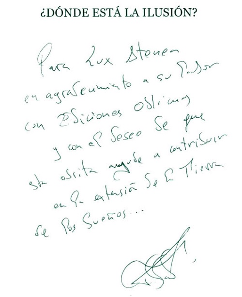 “¿Dónde está la ilusión?” es el título del nuevo libro del genial escritor Alberto Trinidad, publicado por Ediciones Oblicuas en esta edición bilingüe español/catalán con ilustraciones a cargo del dibujante David Sarrá. Como los cultos lectores de Lux Atenea ya se imaginan, el título de esta obra está inspirado en la lírica del precioso tema de La Dama se Esconde “Más Allá del Sol”, mítico dúo musical español de la década de los ochenta. Del libro “¿Dónde está la ilusión?”, lo primero que sorprenderá al lector es que está escrito como si fuera el guión de una obra de teatro dirigida a un público infantil. Dividido en seis escenas, en cada uno de estos apartados de la obra se ha detallado con precisión tanto los escenarios como los personajes y la acción que allí se desarrolla, haciendo especial hincapié en el gesto como expresiva clave literaria. Fascinación por el detalle al cual Alberto Trinidad nos tiene ya acostumbrados en sus grandiosas obras. Esta ambientación infantil se ve reforzada al ser Sandro el personaje principal de esta historia, un niño afectado por la desgracia familiar hasta quedar su corazón lleno de dolor y desilusión. Por este motivo, su actitud arisca con las personas que le rodean (y que le quieren) tiene como origen, creer que son incapaces de comprender y de sentir su profundo dolor y su tremendo vacío interior que viene sufriendo desde tan trágico suceso. Sandro se mantiene aferrado al aislamiento y a la soledad en su cuarto como refugio seguro ante un entorno abiertamente hostil. Tras quedarse dormido, entrará en este mundo feérico llamado Oniria y, una vez allí, su encuentro con esta hada de los sueños llamada Nit lo cambiará todo. A partir de aquí, se cruzarán en su destino desde un impertinente coro de hadas un poco cotillas, a faunos-bufones un tanto risueños, o el solemne Señor de los Sueños que siempre viene acompañado por su inseparable edecán. Sin duda alguna, “¿Dónde está la ilusión?” es una obra de teatro de atrayente temática e interesante moraleja, y, analizando su trasfondo, creo que es artísticamente idonea para ser interpretada sobre el escenario ante un público infantil porque los simpáticos personajes que pueblan este mágico mundo tienen alma y profundidad en su mensaje. Como no podía ser de otra forma, en este nuevo libro de Alberto Trinidad no podían faltar las referencias a su obra maestra “Minorías de uno”, manteniendo lazos de unión con este mundo de magia, de encanto, y de evasión hacia mundos más benignos y luminosos. “¿Dónde está la ilusión?”, en Lux Atenea siempre será un honor reseñar las magnas obras literarias de Alberto Trinidad, uno de los escritores con más talento que hayan aparecido en la escena cultural española en las últimas décadas. ¡¡¡Disfrútenlo!!!