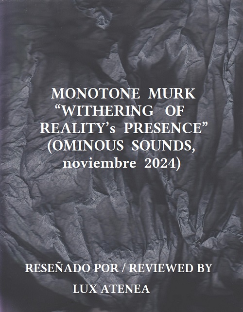 Moralmente hundidos, el tema “Ennui I – Despondency” ahondará en esta sensación de perdición donde nada proyecta algo de luz alrededor, algo de sensibilidad, algo de espiritualidad, proyectando este estilo dark ambient una atmósfera sonora gélida donde su estructura musical es decorada con maestría con estos planos melódicos absolutamente hipnóticos durante su audición. Este carácter artístico tan innovador es lo que encumbra a Monotone Murk dentro de esta escena como referencia artística en la actualidad, y esta creatividad aún quedará resaltada en el tema “Ennui II – Memory Lane” donde este iridiscente estilo ambient se vuelve cristalino mientras deriva progresivamente hacia el dark ambient por su belleza siniestra. Una obscura delicatessen musical que incitará a los melómanos lectores de Lux Atenea a repetir su audición varias veces más antes de llegar a la clausura de este álbum. ¡¡¡“Ennui II – Memory Lane”, excelsa composición musical!!! Cerrando este grandioso álbum, “Flesh Departure” es un tema musical dedicado a la legendaria artista ocultista alemana Andrea Haugen Nebelhexe (1969-2021) (Aghast, Hagalaz’ Runedance, Nebelhexë…), y cuya atmósfera sonora transforma el estilo dark ambient en un melódico spleen existencial mientras se observa el final de todo lo que nos rodea. Un obscuro epílogo, un tenebroso presente porque lo que se está desmoronando es el futuro de forma irremediable, y sólo lo espiritual es lo que permite permanecer en pie porque el alma está unido a lo eterno más allá de lo carnal y de la existencia de lo físico en el presente, mientras el Reino de la Muerte ya nos alcanza extendiendo su mano para que la tomemos. “Withering of Reality’s Presence”, el sello discográfico español Ominous Sounds vuelve a deslumbrarnos con otra edición discográfica espectacular protagonizada en esta ocasión por Monotone Murk, y esta avanzada y contundente obra maestra musical dentro de la escena dark ambient. ¡¡¡Disfrútenlo!!!