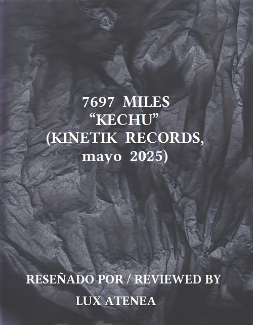 Con el tema “Vichuquen” oscureciendo completamente el escenario musical, sus destellos luminosos como estrellas en el cielo nocturno rápidamente van a adquirir un trasfondo tenebroso con la entrada de pinceladas sonoras de lo más inquietantes. Casi orgánico y vivo en su desarrollo, “Vichuquen” perfectamente podía ser la banda sonora de una mansión abandonada donde lo espectral se manifiesta de forma sutil, pero aterradora. Con sus planos melódicos dando claridad a un escenario marcado por lo decadente, la entrada de este lúgubre pasaje melódico confirmará lo intuido desde el comienzo del tema, reafirmando su oscuridad tan inteligentemente definida como una orquestación material de lo diabólico, siempre oculto tras el velo de la realidad. Oscilando conceptualmente en la frontera del ambient con el dark ambient, el tema “Vichuquen” llevará al melómano lector de Lux Atenea a repetir su audición debido a este interesante despliegue de matices sonoros, organizados en dos pilares contrapuestos donde la luz y la oscuridad no se mezclan, sino que crean un conjunto global espectacular. ¡¡¡“Vichuquen”, pura armonización conceptual!!! Luego, el tema “Aiwiñ” nos llevará de nuevo a un escenario futurista pero mucho más nítido y expansivo que en “Fill Kolor”, y con una amplia perspectiva del entorno desde lo alto abarcando la extensa presencia del desarrollo más avanzado. “Aiwiñ” abre el horizonte, expande la mente, y con la mirada estimulada con este espectáculo tan activo como mágico, al final del tema uno se queda con la sensación de haber sentido lo que puede llegar a ser una futura civilización altamente tecnificada. En el tema “Yelmen”, con 7697 Miles sorprendiéndonos con otra contundente muestra de su talento en la composición, los sentidos quedarán fascinados con esta inmersión musical cuyo firme tempo crea la base perfecta para elevar estas columnas sonoras absolutamente brillantes. De espíritu experimental, en “Yelmen” se entremezclan bases rítmicas propias de lo tribal con melodías electrónicas de la década de los setenta, y con planos sonoros experimentales que le dan esta aura de vanguardia que lleva a este conjunto musical a lo ecléctico de forma muy clara. Finalmente, el tema “Kimngeay” clausurará este impresionante álbum perfilando una estructura musical de tormentosos claroscuros, disipándose de forma progresiva con este estilo high-tech ambient de primer nivel. Nueve minutos de puro disfrute a través de escenarios sonoros impredecibles, y de una viveza radiante que contrasta completamente con su trasfondo oscuro. La discreta entrada de bases rítmicas le irán dando un mayor dinamismo e impulso, pero de forma controlada para que sus matices electrónicos sigan siendo los protagonistas en este grandioso despliegue musical. “Kechu”, 7697 Miles en estado de máxima creatividad artística dentro de su avanzada mirada conceptual de vanguardia. ¡¡¡Disfrútenlo!!!