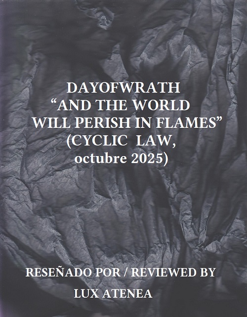 El próximo día 3 de octubre será presentada oficialmente esta re-edición del álbum Dayofwrath “And The World Will Perish In Flames”, editado originalmente en cassette por el sello estadounidense Cloister Recordings en el año 2021. Publicado a través del prestigioso sello discográfico Cyclic Law en formato digital y en una magnífica edición limitada de 300 unidades en digipak CD de cuatro paneles, el álbum “And The World Will Perish In Flames” ha sido engalanado con esta nueva imagen de portada donde los aires siniestros y apocalípticos son mucho más directos a nivel visual, proyectando esa caída violenta propia de una gran civilización sumida en el caos y en su hundimiento. Un impresionante álbum de debut donde el artista nacional Isaac Enrich perfiló en clave conceptual black industrial, estos cuatro temas que vertebran la obra y cuya perspectiva creativa impactará al melómano lector de Lux Atenea por su avanzada definición artística. Poseedor de una experiencia musical desarrollada en DE·TA·US·TO·AS y Wax Model, el genial artista Isaac Enrich nos ofrece en Dayofwrath, esta mirada conceptual vanguardista dentro del black industrial a través de potentes estructuras musicales donde la lírica es esencial en su mensaje, habiendo contado con la colaboración de Julian Nüesch en el tema “Voidhanger” dentro de este apartado. Este álbum ha sido masterizado por Frédéric Arbour (Cyclic Law) hasta alcanzar su sonoridad más nítida, además de potenciar el impacto musical de estas atmósferas lúgubres y extremas que envuelven al melómano, y que lo sitúan en el epicentro de este terrible colapso propio de un aciago destino, como suele terminar cualquier grandioso proyecto, sociedad, o civilización porque la corrupción es propia e inseparable de lo humano, convirtiéndose en el veneno de esa sociedad y en el ácido que corroe cada uno de los pilares que la sostienen. Un ciclo inexorable de creación-expansión-corrupción-colapso que siempre se cumple independientemente de la época donde nazca, del lugar geográfico donde aparezca, de la avanzada tecnología que desarrolle, o de la religión que domine su sociedad, desarrollándose a lo largo del tiempo con siniestra eficacia hasta el final en su evolución. Lo humano y lo corrupto, dos caras de una misma moneda.