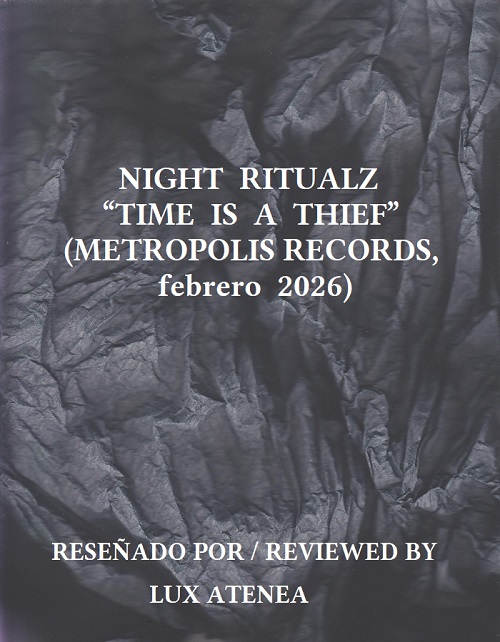 Night Ritualz, después de su extraordinario álbum de debut homónimo presentado en el año 2025 (ya reseñado en Lux Atenea), a finales el pasado mes de febrero vio la luz su segundo álbum “Time Is A Thief” a través del mismo sello discográfico Metropolis Records. Publicado en formato digital, en una magnífica edición en CD, y de una selecta edición en vinilo LP 12”, se encuentran disponibles tanto en la webstore del sello como en su página oficial en Bandcamp. Engalanado con este diseño de portada retro donde lo underground dentro de la escena darkwave marca la clásica imagen desgastada en baja definición, como impresa en una fotocopiadora antigua, vuelve a tener al artista estadounidense Vincent Guerrero IV, alma mater de Night Ritualz, como protagonista principal mostrando esa actitud de decaimiento existencial, esa decadencia vital, y esa rendición ante un destino considerado como pérdida de su esencia personal en un entorno salvaje, agresivo, e inmisericorde. A nivel musical, en este nuevo álbum, Night Ritualz eleva su virtuosismo artístico a la hora de componer temas musicales darkwave de vanguardia con una brillantez conceptual que encantará a los melómanos lectores de Lux Atenea identificados en cuerpo y alma con la escena dark. Vertebrado por diez temas que sorprenden por su eclecticismo conceptual, la plasticidad de idioma inglés y del español moldean con suma belleza oscura cada una de estas canciones a nivel lírico, proyectando un encanto musical aún más espectacular que en su álbum de debut homónimo (Metropolis Records, 2025). Night Ritual llegó para ampliar las fronteras conceptuales de esta escena, y con el álbum “Time Is A Thief” aún toma mayor impulso en este proceso imparable de transformación y de ampliación artística de sus estructuras sonoras, creando un universo musical darkwave que podrán disfrutar en su esencia más auténtica en la magnífica edición en vinilo LP 12” por su calidad sonora.